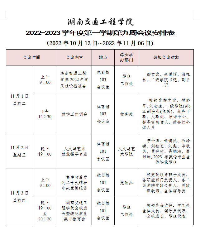 湖南交通工程學(xué)院2022-2023學(xué)年度第一學(xué)期第九周會(huì)議安排表