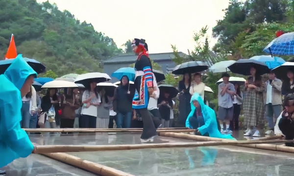 在天堂山廣場,師生們跟著瑤鄉(xiāng)帥哥靚妹跳起了竹桿舞。隨著“開、合、開、合、開開合”明快的節(jié)奏,大家的熱情一再高漲?,庎l(xiāng)老師一會把現(xiàn)代歌曲元素融入竹竿舞,引起同學們陣陣喝彩;一會又將古典舞蹈融匯入竹竿舞,古色古香,讓人嘆為觀止。大家在盡情揮灑青春活力的同時,不僅學習了瑤族歌舞和鼓點韻律,感受了竹竿與舞蹈的結合,親身體會到擊鼓的快感;而且通過民俗傳承老師的講解和教學,在“跳竹竿”中親身感受了集體合作與傳統(tǒng)游戲的魅力。