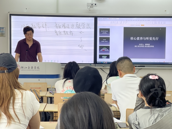 謝銘磊老師主講《核心素養(yǎng)與聽覺先行的教學(xué)策略實踐》。謝銘磊,浙江音樂學(xué)院音樂教育學(xué)院教學(xué)部主任,擔任學(xué)院研究生、本科生教學(xué),兼任全國基教音樂名師工作室聯(lián)盟副秘書長。謝老師長期扎根國民藝術(shù)教育,既擁有國際教育理論,同時突出課堂教學(xué)的實際運用,研究方向主要有藝術(shù)教育的方法策略、教材運用、特色教學(xué)等;其講授十余年的《音樂學(xué)科綜合教學(xué)法》被評為浙江省省級一流課程。