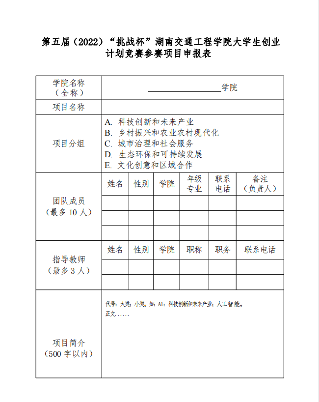 4、把握節(jié)點,及時報送。推薦校賽的作品以二級學院為單位,填寫匯總表 (附件 2)統(tǒng)一報送,每份作品需提交項目申報表(附件 1)、項目介紹書、 項目路演 PPT 及其他證明材料。紙質檔 1 份用檔案袋標注封面報送到航母樓2006,電子版報送至:hnjtgcxytw@163.com。