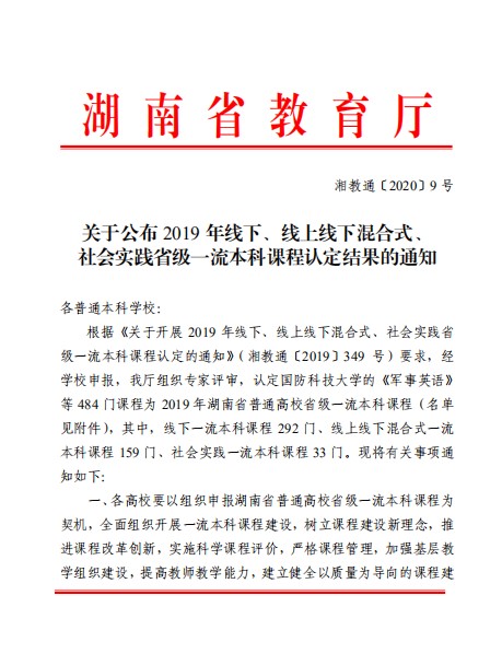 根據(jù)湖南省教育廳《關(guān)于開展2019年線下、線上線下混合式、社會實(shí)踐省級一流本科課程認(rèn)定的通知》(湘教通〔2019〕349號),交通運(yùn)輸工程學(xué)院積極響應(yīng),經(jīng)先期建設(shè)并申報,我院申請的《材料力學(xué)》認(rèn)定為省級線下一流本科課程(湘教通〔2020〕9 號)。