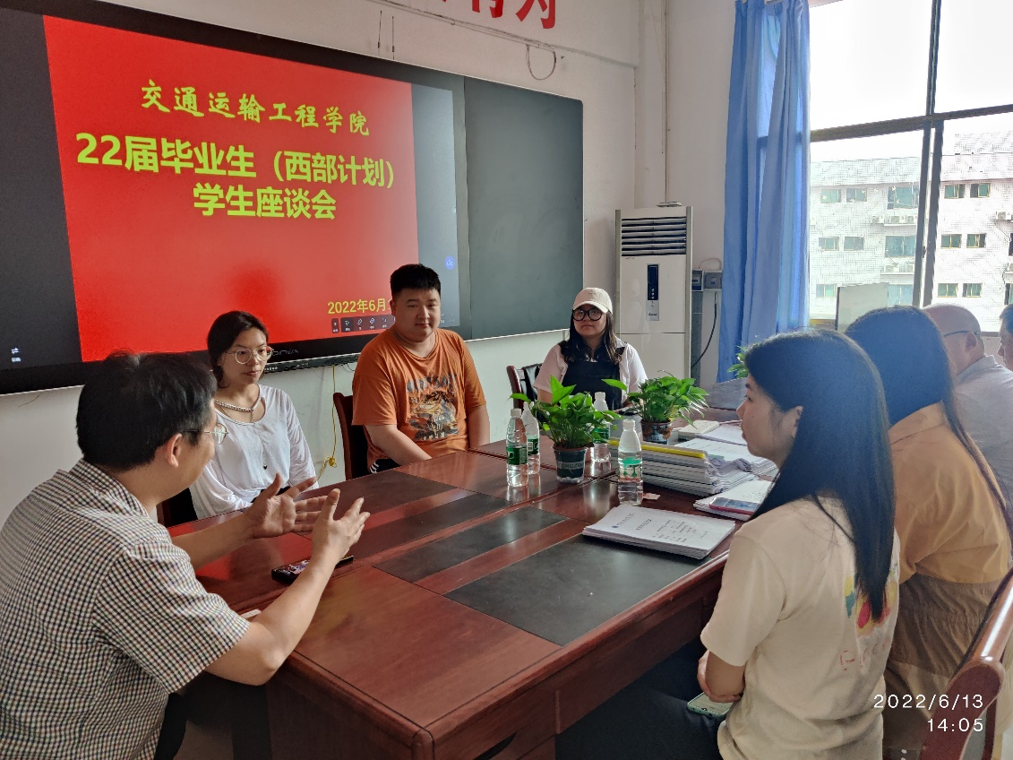 本網(wǎng)訊(通訊員 黃順)6月13日下午,交通運(yùn)輸工程學(xué)院2022年“西部計(jì)劃”志愿者座談會(huì)在機(jī)電樓511辦公室召開(kāi)。出席本次座談會(huì)的有交通運(yùn)輸工程學(xué)院黨總支書(shū)記何美生、黨總支副書(shū)記何文華和五名自愿加入“西部計(jì)劃”的志愿者。