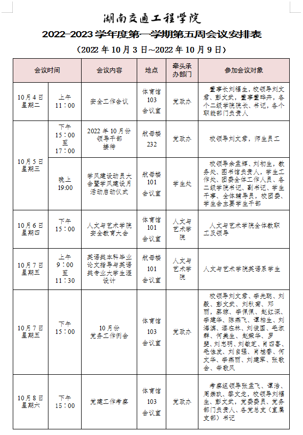 湖南交通工程學(xué)院2022-2023學(xué)年度第一學(xué)期第四周會(huì)議安排表