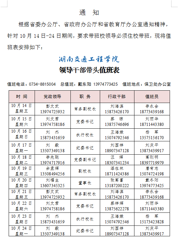 湖南交通工程學(xué)院領(lǐng)導(dǎo)干部帶頭值班表