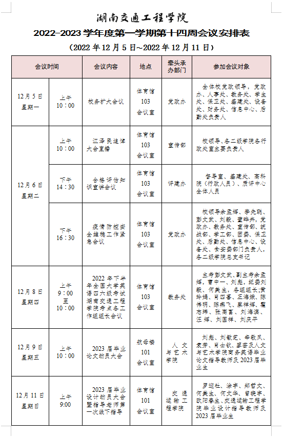 湖南交通工程學(xué)院2022-2023學(xué)年度第一學(xué)期第十四周會(huì)議安排表