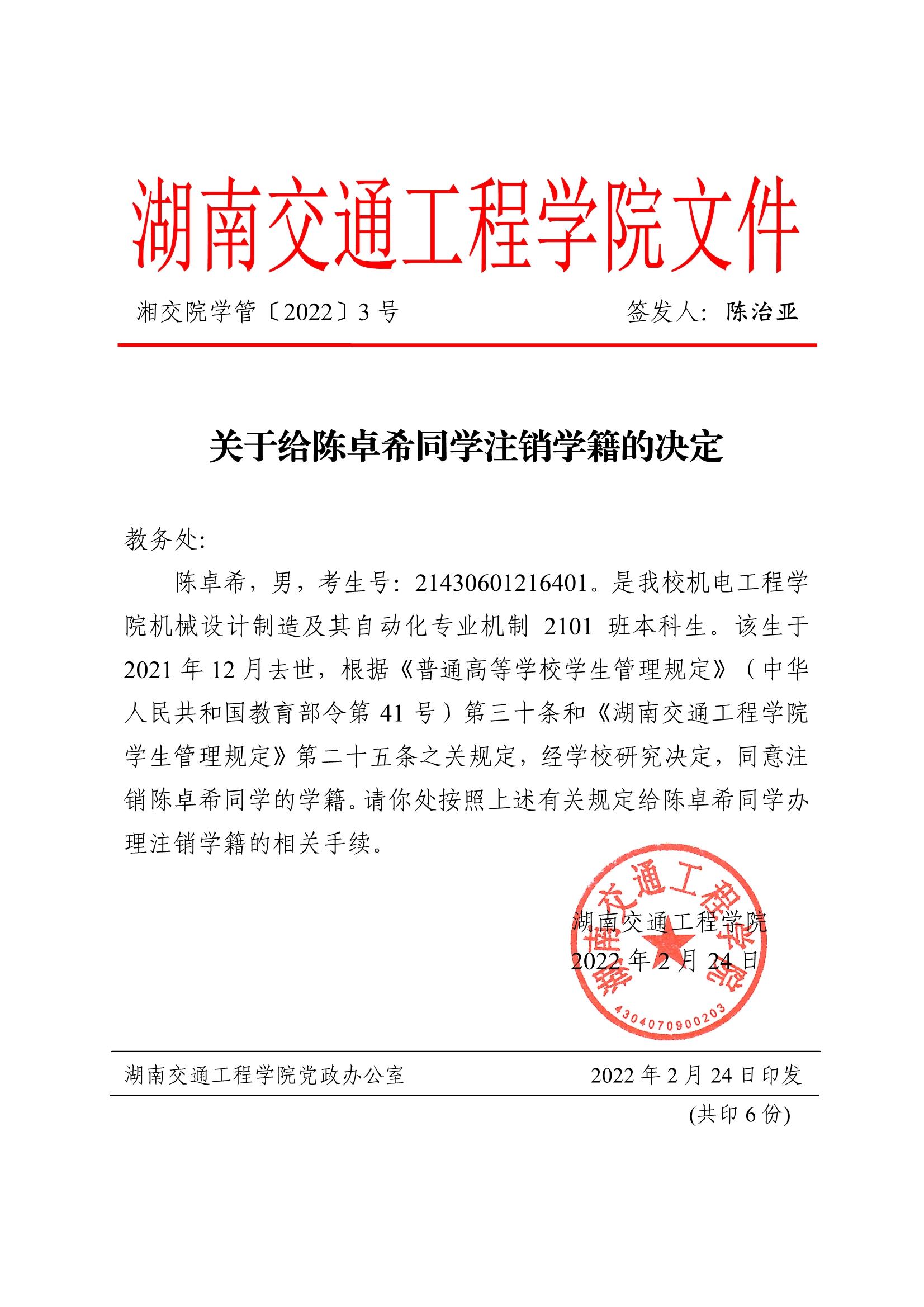 關(guān)于給陳卓希同學(xué)注銷學(xué)籍的決定(湘交院學(xué)管〔2022〕3號(hào))