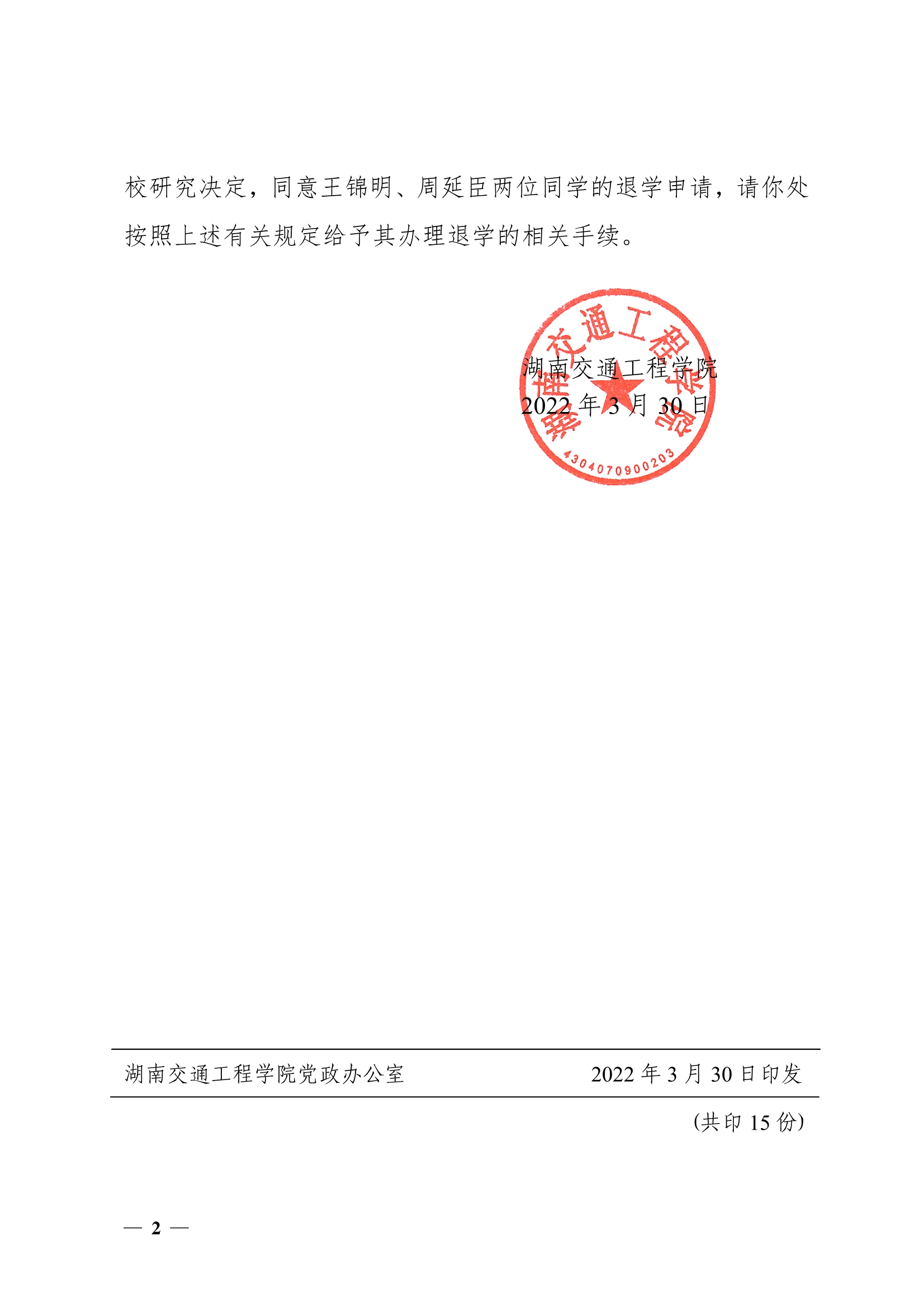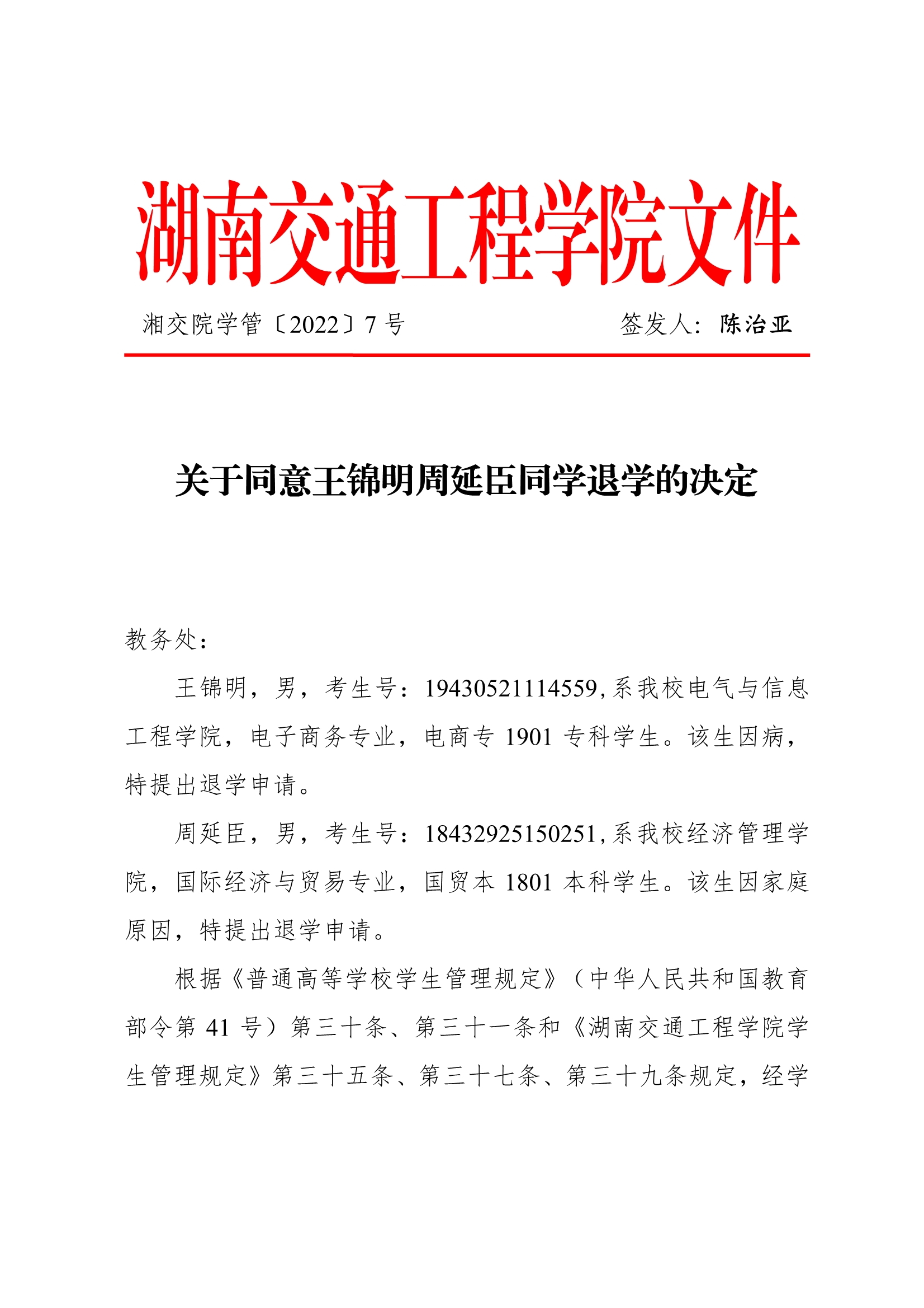 關(guān)于同意王錦明周延臣同學(xué)退學(xué)的決定(湘交院學(xué)管〔2022〕7號(hào))