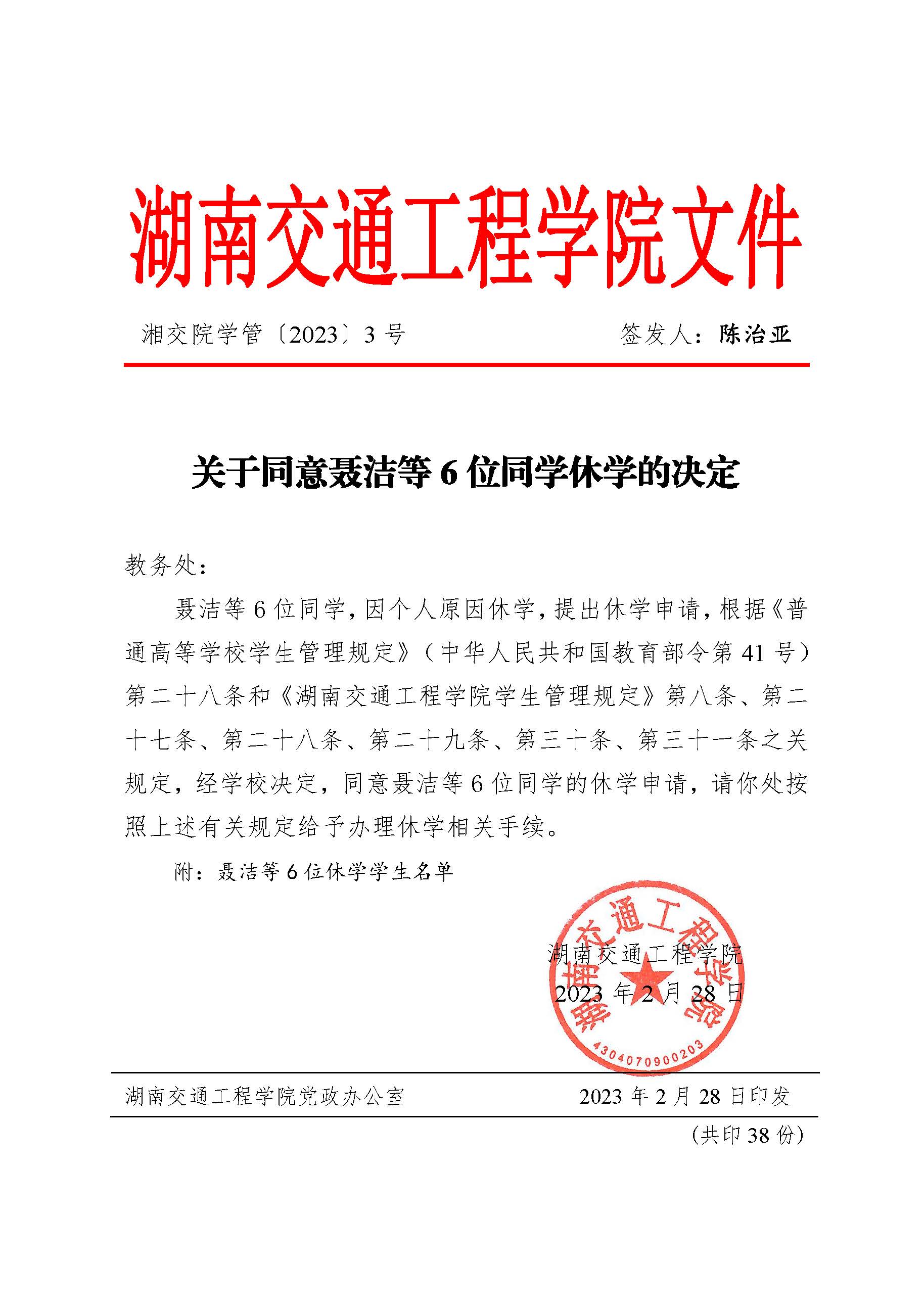 關(guān)于同意聶潔等6位同學(xué)休學(xué)的決定(湘交院學(xué)管〔2023〕3號(hào))