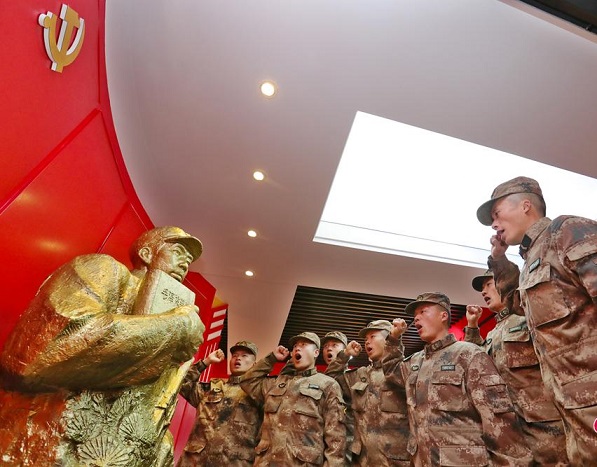 戰(zhàn)士們面對王杰雕像莊嚴(yán)宣誓