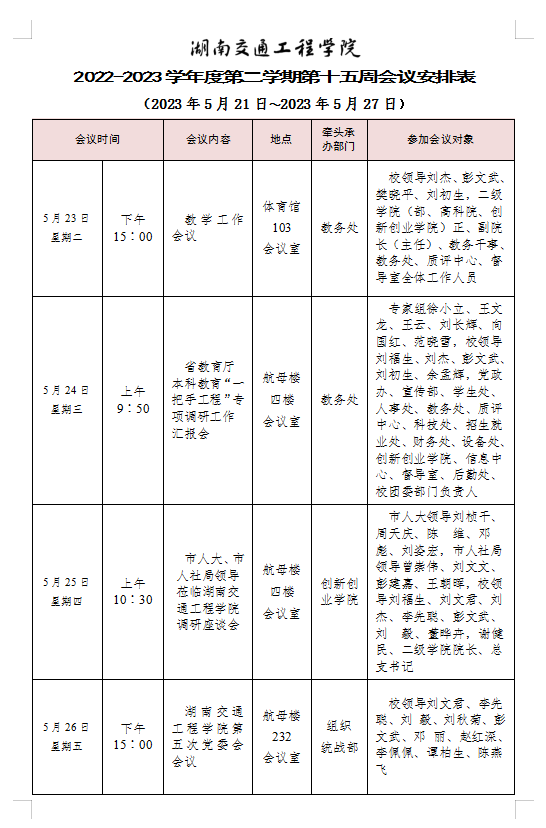 湖南交通工程學(xué)院2022-2023學(xué)年度第二學(xué)期第十五周會議安排表