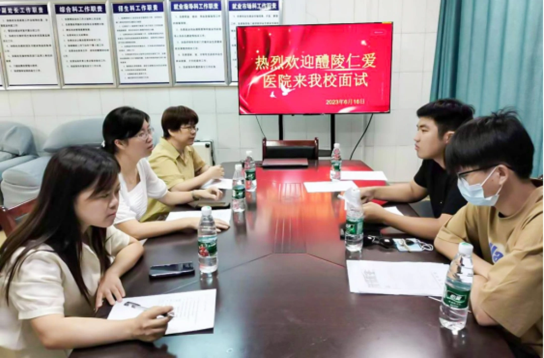 湖南省醴陵市仁愛醫(yī)院等醫(yī)院進校攬才,招聘單位通過播放宣傳片、PPT展示、面對面交流等方式向同學(xué)們介紹公司概況、薪酬待遇、發(fā)展前景、崗位需求等情況,畢業(yè)生們與醫(yī)院招聘人員面對面咨詢交流洽談,并按照自己的求職意向投遞簡歷。