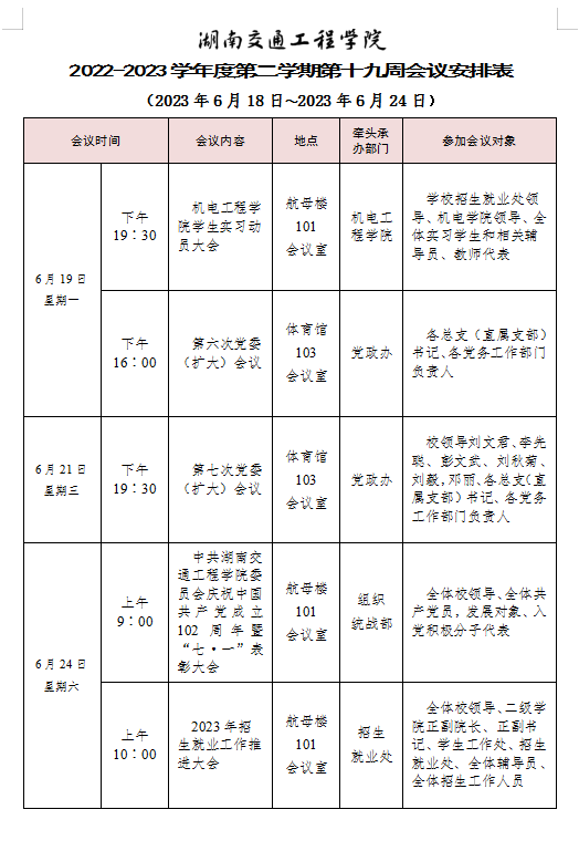 湖南交通工程學(xué)院2022-2023學(xué)年度第二學(xué)期第十九周會(huì)議安排表