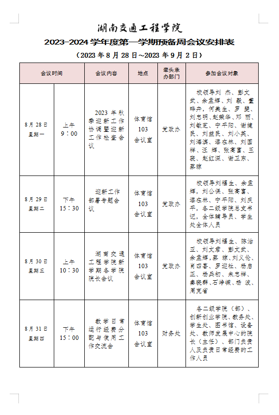 湖南交通工程學(xué)院2023-2024學(xué)年度第一學(xué)期第一周會(huì)議安排表