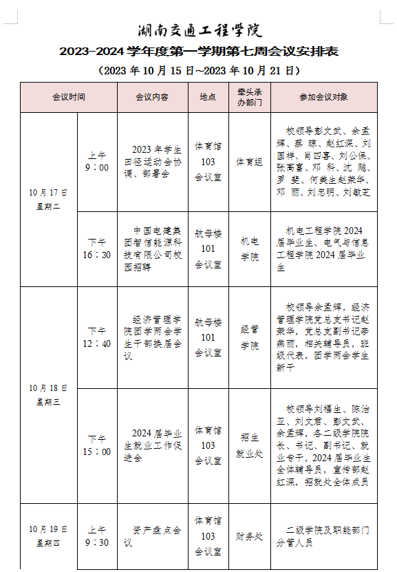 湖南交通工程學(xué)院 2023-2024學(xué)年度第一學(xué)期第七周會(huì)議安排表