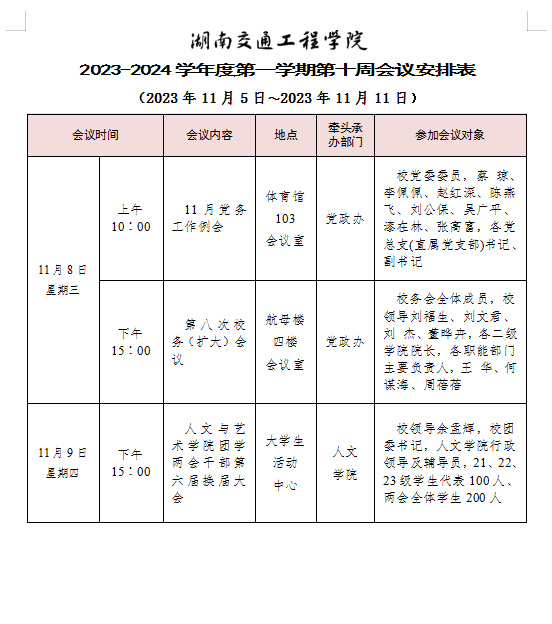 湖南交通工程學(xué)院 2023-2024學(xué)年度第一學(xué)期第十一周會(huì)議安排表