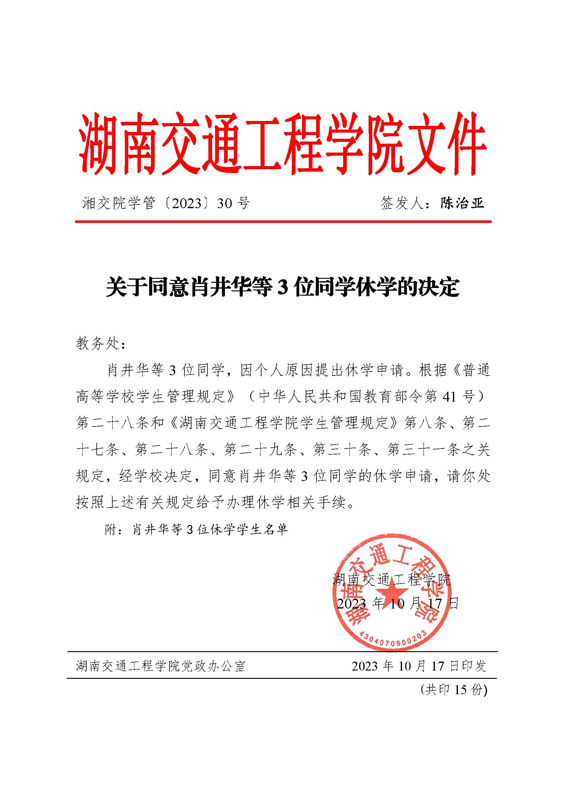 關于同意肖井華等3位同學休學的決定(湘交院學管〔2023〕30號)
