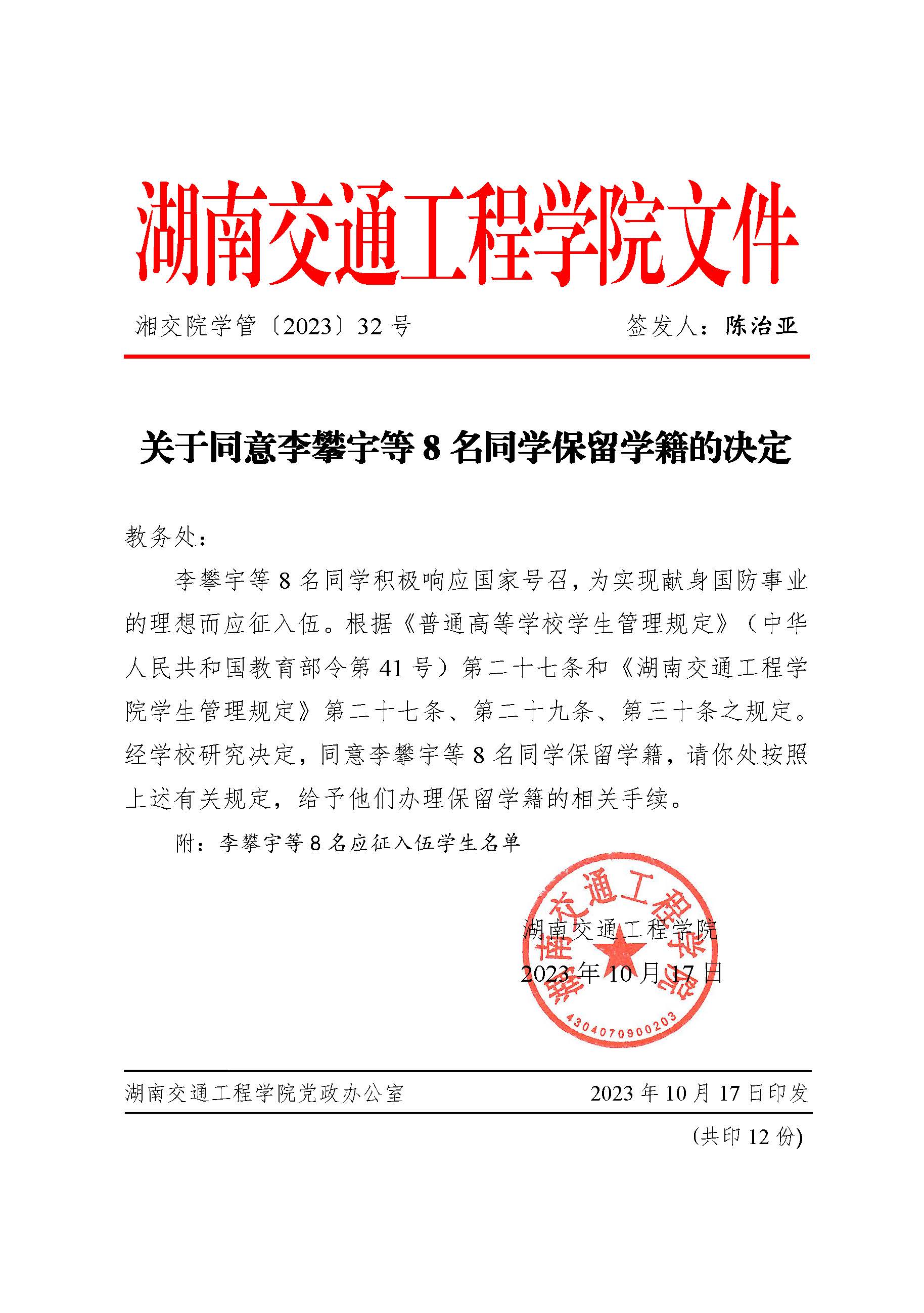 關(guān)于同意李攀宇等8名同學(xué)保留學(xué)籍的決定(湘交院學(xué)管〔2023〕32號(hào))