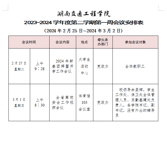 湖南交通工程學(xué)院2023-2024學(xué)年度第二學(xué)期第一周會(huì)議安排表