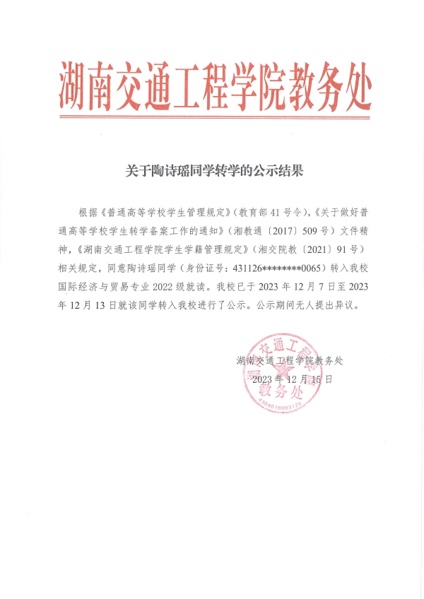 關(guān)于陶詩瑤同學(xué)轉(zhuǎn)學(xué)申請的公示結(jié)果