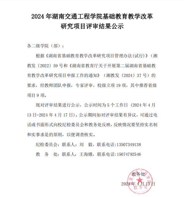 2024年湖南交通工程學(xué)院基礎(chǔ)教育教學(xué)改革研究項(xiàng)目評(píng)審結(jié)果公示