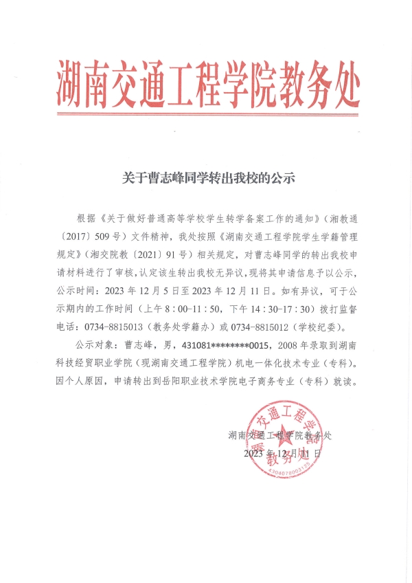 關(guān)于曹志峰同學轉(zhuǎn)出我校的公示