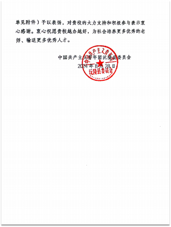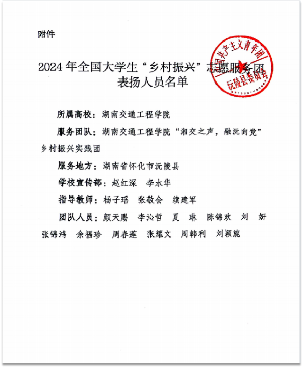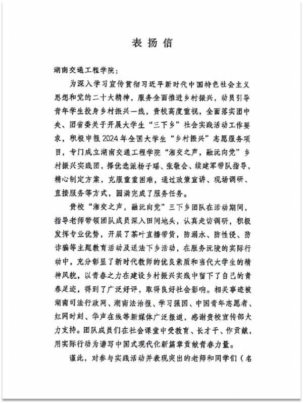 本網(wǎng)訊(通訊員 楊子瑤)近日,我校經(jīng)濟(jì)管理學(xué)院“湘交之聲,融沅向黨”鄉(xiāng)村振興實踐團(tuán)收到了來自沅陵縣司法局和中國共產(chǎn)主義青年團(tuán)沅陵縣委員會等單位的表揚信。信中沅陵縣司法局和團(tuán)縣委對團(tuán)隊在暑期三下鄉(xiāng)活動中的表現(xiàn)給予高度肯定,表達(dá)了對團(tuán)隊成員辛勤工作的真摯謝意。