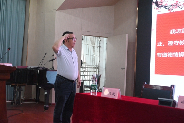 全體新入職教師集體宣誓,馮良貴領(lǐng)讀《教師誓詞》。