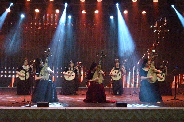 古箏重奏《天山之歌》展現(xiàn)出別樣風(fēng)情。陳杏婷同學(xué)領(lǐng)銜11位古箏演奏者指尖齊動(dòng),把古箏特有的空靈音色,將人們帶到了遙遠(yuǎn)的天山腳下。尤其是陳杏婷同學(xué)的古箏獨(dú)奏、崔碧瑩老師鋼琴伴奏的《定風(fēng)波》更是把晚會(huì)推向了高潮,掌聲、吶喊聲、歡呼聲一浪高過(guò)一浪。那清脆悅耳的音符,似雪山融化的清泉流淌,又似草原上微風(fēng)拂過(guò)的輕響,描繪出一幅天山壯美秀麗的風(fēng)光畫(huà)卷,使觀眾仿若身臨其境,陶醉于這充滿異域風(fēng)情的音樂(lè)之中。