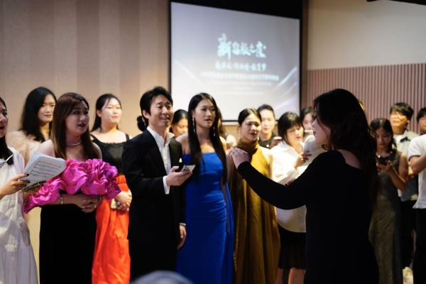 燈光漸暗,舞臺(tái)上全體合唱演員身姿挺拔,神情莊重?!冻悄纤蛣e》前奏響起,他們張口,歌聲如潺潺流水,哀愁與期許交織,編織懷舊畫(huà)卷。歌聲時(shí)而輕柔婉轉(zhuǎn),時(shí)而雄渾激昂,演員配合默契,完美展現(xiàn)離情眷戀。指揮歐婷優(yōu)雅地站在前方,精準(zhǔn)掌控節(jié)奏,靈動(dòng)的雙手引領(lǐng)音樂(lè)起伏。幕后的藝術(shù)指導(dǎo)劉怒成精心雕琢細(xì)節(jié),憑借深厚造詣提升演出質(zhì)量。葉子青專注吹奏長(zhǎng)笛,悠揚(yáng)笛聲為晚會(huì)添詩(shī)意,與歌聲呼應(yīng)。在全體演員合唱電影《城南舊事》的主題曲《城南送別》的悠揚(yáng)歌聲中,晚會(huì)圓滿落幕。這場(chǎng)演出作為中新教育文化交流的生動(dòng)寫(xiě)照,在全球觀眾心中留痕,弦歌雅韻也將在教育夢(mèng)想途中持續(xù)回響。