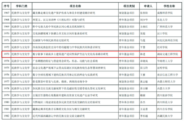本網(wǎng)訊(通訊員 )近日,教育部社科司公布了2024年度教育部人文社會科學研究一般項目立項名單,我校交通運輸工程學院林進老師主持申報的“數(shù)字敘事下湖南鄉(xiāng)土建筑遺產(chǎn)適應性保護方法與文化傳承路徑研究”獲批立項。這是我校首次獲批該類項目立項。