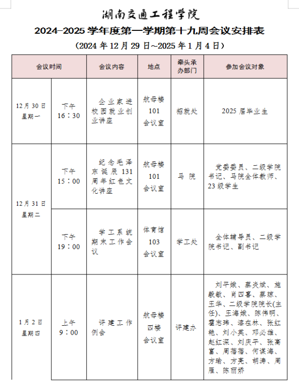 湖南交通工程學(xué)院2024-2025學(xué)年度第一學(xué)期第十九周會(huì)議安排表