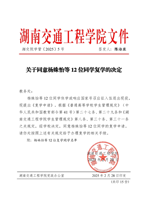 關于同意楊姝怡等12位同學復學的決定(湘交院學管〔2025〕5號)