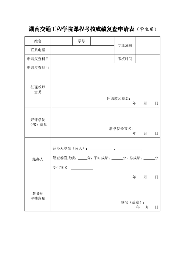 湖南交通工程學(xué)院課程考核成績復(fù)查申請(qǐng)表(學(xué)生用)