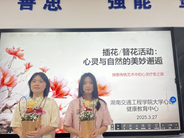 在青春的旅程中,心靈的成長與美好體驗同樣重要。2025 年3 月27 日晚七點,湖南交通工程學院大學生心理健康咨詢中心別出心裁,將傳統(tǒng)文化與心理療愈巧妙融合,于教學樓四個會場同步開展“簪花解憂、春日療心”插花手工DIY簪花活動。500 余名學生以指尖為筆,以鮮花為墨,在簪花制作與創(chuàng)意插花的過程中,開啟了一場治愈心靈的芳香之旅,為校園注入了溫馨與活力。