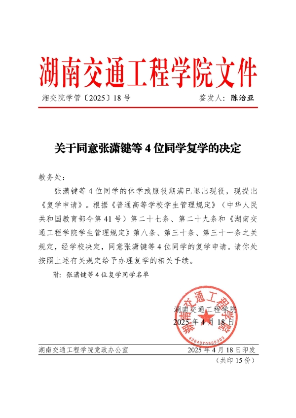 關(guān)于同意張瀟鍵等4位同學(xué)復(fù)學(xué)的決定(湘交院學(xué)管〔2025〕18號(hào))