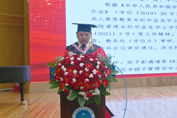 余孟輝宣讀《關(guān)于表彰湖南省普通高等學(xué)校2025屆優(yōu)秀畢業(yè)生的決定》,《關(guān)于公布湖南交通工程學(xué)院2025屆優(yōu)秀畢業(yè)生和創(chuàng)新創(chuàng)業(yè)優(yōu)秀畢業(yè)生的通知》。我校127名同學(xué)獲省級(jí)優(yōu)秀畢業(yè)生,11名同學(xué)獲省級(jí)創(chuàng)新創(chuàng)業(yè)優(yōu)秀畢業(yè)生;169同學(xué)獲校級(jí)優(yōu)秀畢業(yè)生,21名同學(xué)獲校級(jí)創(chuàng)新創(chuàng)業(yè)優(yōu)秀畢業(yè)生。他肯定了同學(xué)們的拼搏精神與責(zé)任擔(dān)當(dāng),同時(shí)期望受表彰者珍惜榮譽(yù)、保持謙遜、再接再厲,在未來創(chuàng)造更優(yōu)成績(jī);也期望2025屆全體畢業(yè)生以優(yōu)秀同學(xué)為榜樣,立大志、擔(dān)使命、惜韶華、勇進(jìn)取,將所學(xué)投身社會(huì)實(shí)踐,用實(shí)際行動(dòng)報(bào)效國(guó)家。