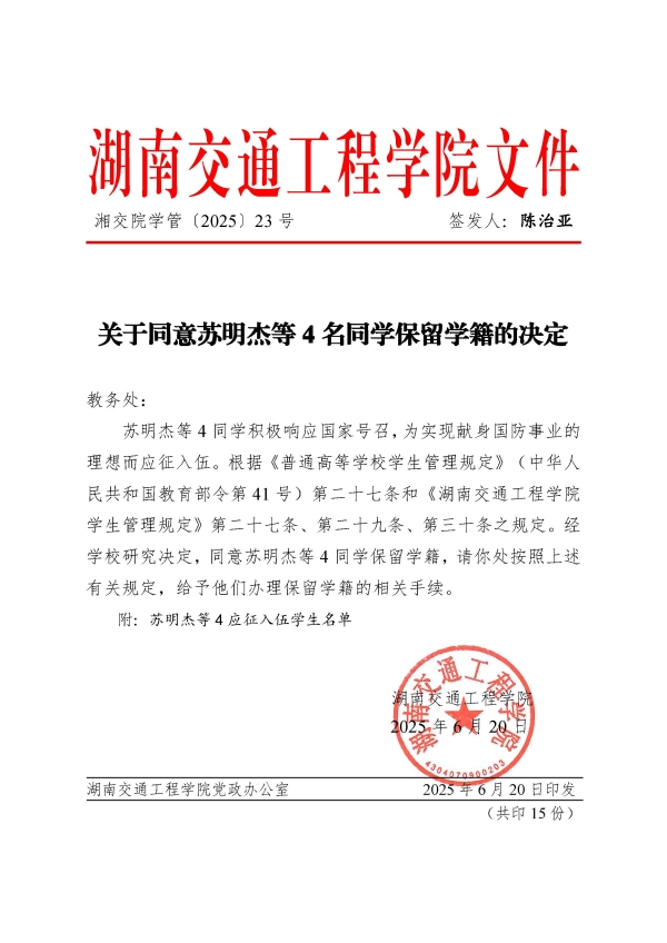 關(guān)于同意蘇明杰等4名同學保留學籍的決定(湘交院學管〔2025〕23號)