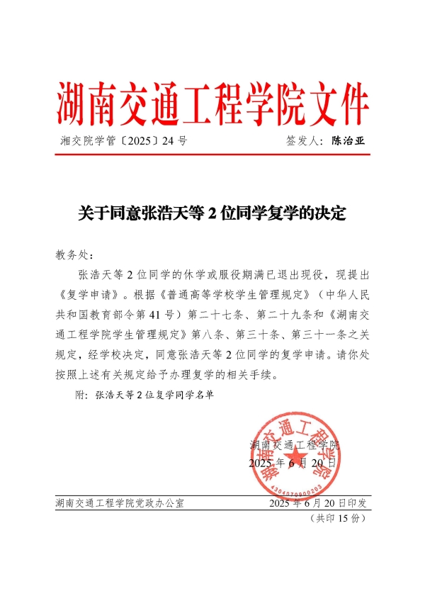 關(guān)于同意張浩天等2位同學(xué)復(fù)學(xué)的決定(湘交院學(xué)管〔2025〕24號(hào))