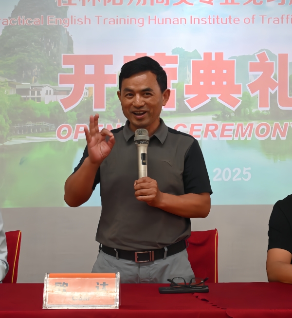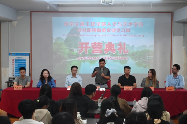 肖四喜作典禮致辭。他肯定了陽朔英語教學(xué)社會實(shí)踐活動對英語專業(yè)學(xué)生口語能力提升的重要作用,并鼓勵(lì)大家與社會深度互動,讓青春亮麗多彩。肖四喜強(qiáng)調(diào),陽朔享有地球村的美譽(yù),常年有數(shù)千上萬外國人來這旅游、生活和工作,多元文化在此交融;而歐美達(dá)培訓(xùn)基地作為深耕英語教學(xué)與實(shí)踐多年的專業(yè)平臺,不僅擁有成熟的教學(xué)體系、經(jīng)驗(yàn)豐富的師資團(tuán)隊(duì),更能為大家提供“沉浸式”的語言應(yīng)用場景,這正是我們將實(shí)習(xí)地點(diǎn)選在這里的主要原因。校企合作、協(xié)同育人是培養(yǎng)應(yīng)用型人才的必由之路,我們學(xué)校董事長劉福生高度重視學(xué)生的實(shí)習(xí)實(shí)訓(xùn)工作,學(xué)校依托優(yōu)質(zhì)校內(nèi)教育資源,緊扣現(xiàn)代產(chǎn)業(yè)發(fā)展脈搏,將行業(yè)前沿需求深度融入育人全過程,構(gòu)建起 “教學(xué) + 研學(xué)” 雙輪驅(qū)動的特色課程體系。英語專業(yè)的學(xué)習(xí),從來不是“紙上談兵”,語言的生命力,永遠(yuǎn)在真實(shí)的溝通與實(shí)踐中綻放。開營典禮后將由外教一對一進(jìn)行面試,全面考察每一個(gè)同學(xué)的語言表達(dá)能力和溝通能力;晚上將分組前往西街開展社會實(shí)踐活動,任務(wù)涉及文化傳播、宣講中國故事等等。為把這個(gè)資源平臺利用好,他對同學(xué)們提三點(diǎn)期望:一是希望同學(xué)們以“學(xué)習(xí)者”的姿態(tài)沉下心來。不僅要虛心向基地的老師請教,更要學(xué)習(xí)他們將語言技能與文化傳播相結(jié)合的智慧,西街的每一位外國游客都是我們移動的老師。二要以“實(shí)踐者”的勇氣敢嘗試。希望大家珍惜基地提供的教學(xué)實(shí)踐、跨文化交流機(jī)會,大膽、主動與外國友人交流,不怕犯錯(cuò)、善于總結(jié)。同學(xué)們每一次溝通互動,都是提升專業(yè)能力的寶貴契機(jī)。三要以“傳承者”的責(zé)任樹形象。大家在外的一言一行,一舉一動都代表湖南交通工程學(xué)院的形象。希望大家遵守基地的各項(xiàng)規(guī)章制度,尊重當(dāng)?shù)匚幕c基地老師的指導(dǎo),展現(xiàn)湘交院學(xué)子“陽光、自信、堅(jiān)定、有點(diǎn)調(diào)皮”的良好風(fēng)貌,為學(xué)校與基地的長期合作筑牢橋梁。