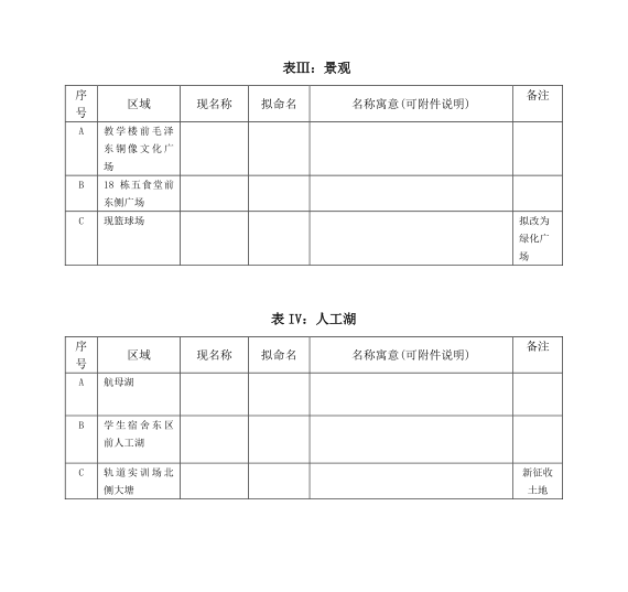 3.校園全部景觀。擬征集名稱的景觀 4 個,其中廣場、綠地等景觀 2 個,人工湖 3 個。(見附件 1、2)。