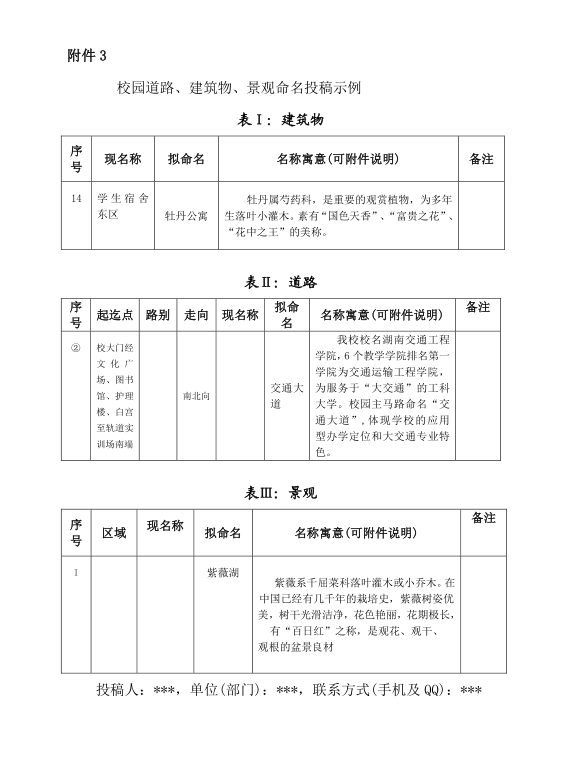 2.名稱要體現(xiàn)我校的辦學(xué)歷史和特色,體現(xiàn)應(yīng)用型辦學(xué)理念、人文底蘊和核心價值觀,體現(xiàn)各類命名的整體性和學(xué)校校園特色,體現(xiàn)命名的教育性,采用交通術(shù)語或工匠精神等名稱來命名(參照附件 4),力求新穎、獨特,弘揚優(yōu)良傳統(tǒng),彰顯人文底蘊。