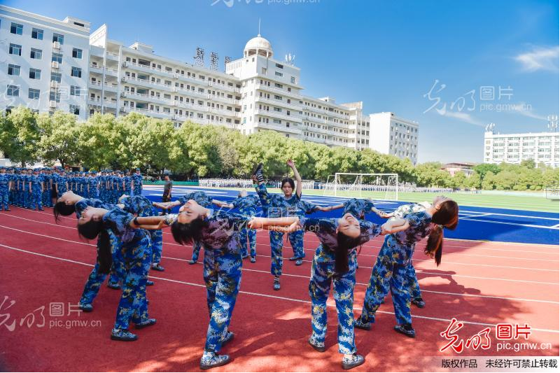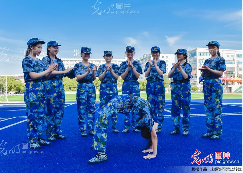 2021年9月3日,湖南交通工程學(xué)院2021級新生在軍訓(xùn)休息時間展示才藝。