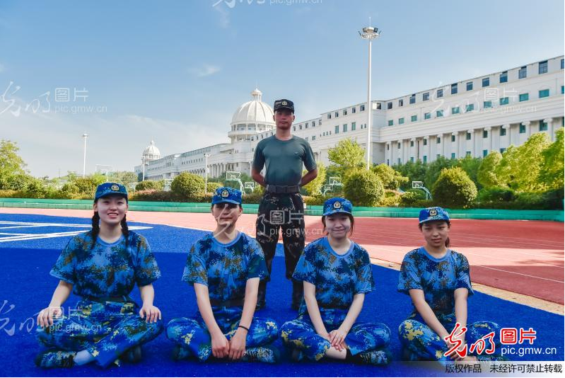 2021年9月3日,湖南交通工程學(xué)院教官在軍訓(xùn)休息時間與新生合影留念。