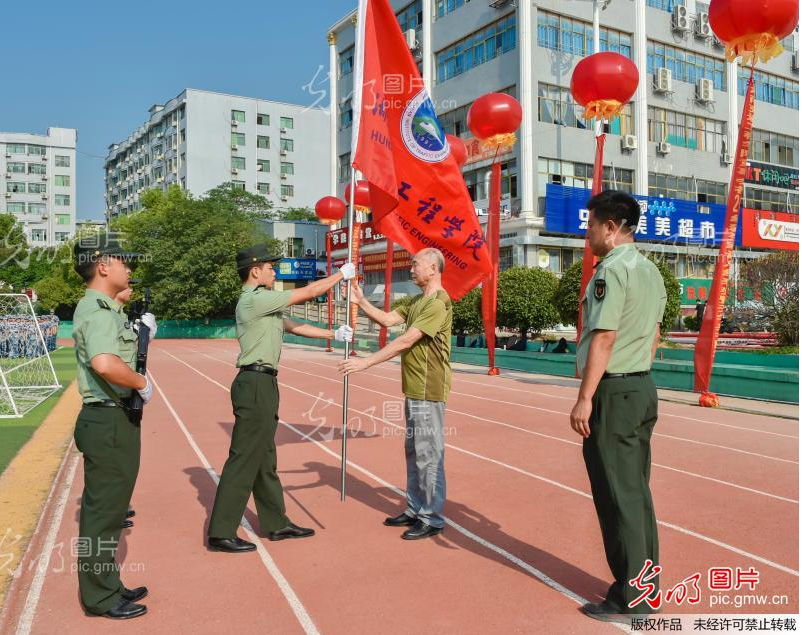 2021年9月17日,湖南交通工程學(xué)院軍訓(xùn)成果匯報(bào)表演現(xiàn)場(chǎng),黨委副書(shū)記李先聰給老兵連授旗。