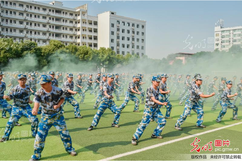 2021年9月17日,湖南交通工程學(xué)院軍訓(xùn)成果匯報(bào)表演現(xiàn)場(chǎng),800人組成的擒敵拳表演方隊(duì)拳腳敏捷,沉著有力。剛勁勇武的拳腿,橫踹側(cè)踢、抱拳立定等動(dòng)作行如流水,贏得熱烈喝彩。