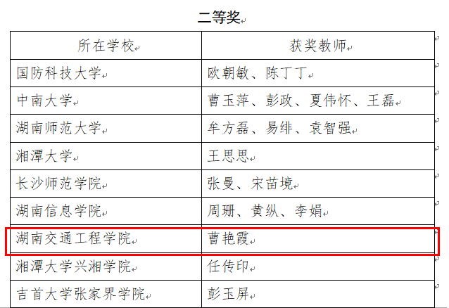 2018年10月27日,湖南省教育廳、湖南省教育工會在長沙理工大學舉行了2018年湖南省普通高校教師課堂教學競賽決賽。根據(jù)省教育廳《關(guān)于 2018年湖南省普通高校教師課堂教學競賽獲獎結(jié)果的通報》(湘教通〔2018〕488 號)文件公布的結(jié)果,我院鐵道工程教研室主任曹艷霞老師喜獲二等獎。