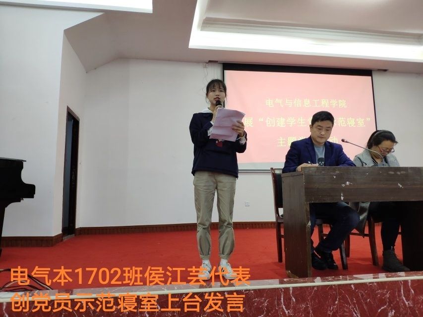 學(xué)生黨員電氣本1702班候江蕓,電氣本1602班許本耀,軟件本1702班王瑞安分別代表學(xué)生黨員做了表態(tài)發(fā)言,開展“創(chuàng)建學(xué)生黨員示范寢室”活動,對我們提出了嚴(yán)格的要求,提醒我們注意自己的行為舉止,處處要以黨員的標(biāo)準(zhǔn)要求自己,做合格的共產(chǎn)黨員;另一方面,要發(fā)揮黨員在日常學(xué)習(xí)生活中的模范帶頭作用,在潛移默化中養(yǎng)成良好的生活習(xí)慣,形成良好的學(xué)風(fēng)。