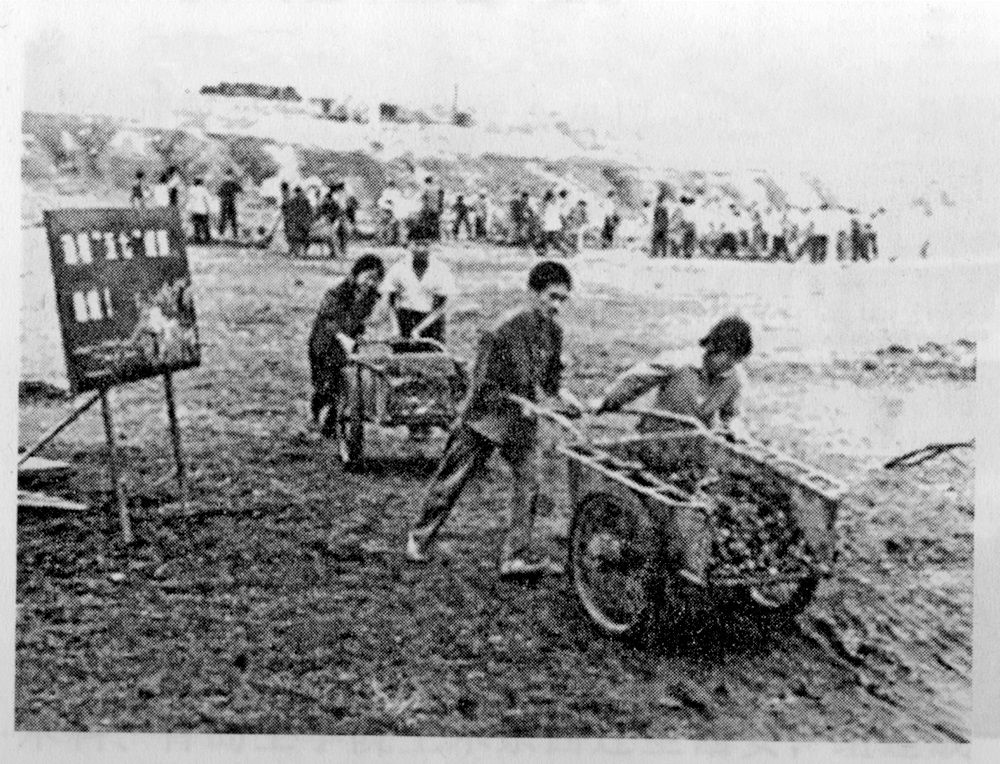 1964年底,經(jīng)中央批準(zhǔn),清華大學(xué)、華東化工學(xué)院、北京大學(xué)、南京大學(xué)遷出部分專業(yè),分別到四川綿陽、四川自貢、陜西漢中、湖南常德建立分校。圖為清華大學(xué)綿陽分校師生在平整場地
