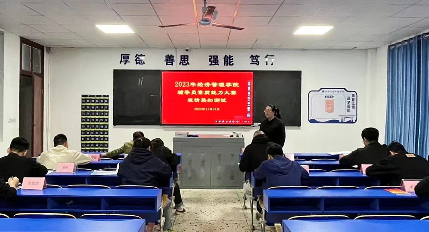 本網(wǎng)訊(通訊員 趙孝鍶)為不斷提升經(jīng)濟管理學(xué)院輔導(dǎo)員的理論水平、職業(yè)能力和專業(yè)素養(yǎng),推動學(xué)生工作高質(zhì)量發(fā)展。11月21日晚上19點,經(jīng)濟管理學(xué)院在教學(xué)樓404教室開展輔導(dǎo)員素質(zhì)能力大賽之“班情熟知”測試。本次測試經(jīng)濟管理學(xué)院全體輔導(dǎo)員參考,學(xué)院黨總支書記趙榮華、副書記李燕麗現(xiàn)場督考。