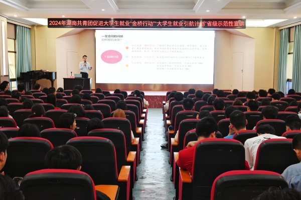 本網(wǎng)訊(記者 趙紅深 攝影 大學(xué)生記者團(tuán) 詹博威 喻威 李怡玲)為進(jìn)一步貫徹落實習(xí)近平總書記關(guān)于就業(yè)工作的重要指示批示精神,根據(jù)湖南共青團(tuán)促進(jìn)大學(xué)生就業(yè)行動計劃工作部署,4月20日下午,由共青團(tuán)湖南省委、湖南省學(xué)生聯(lián)合會主辦,我校承辦的大學(xué)生就業(yè)引航計劃省級宣講活動在航母樓一樓會議室舉行。湖南省學(xué)聯(lián)駐會執(zhí)行主席肖鑫宇出席,我校校團(tuán)委書記漆在林,相關(guān)職能處室負(fù)責(zé)人,各二級學(xué)院書記及400余名畢業(yè)生代表參加活動。漆在林主持。